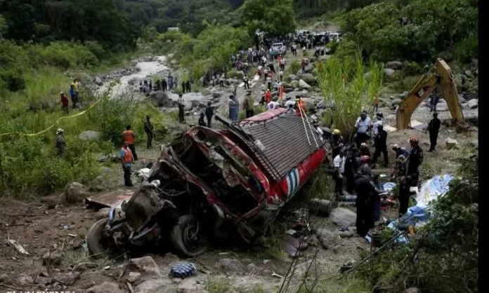 Un fatal accidente en la Calzada La Paz, bajo el puente Belice, ha cobrado la vida de al menos 54 personas y dejado varias más atrapadas. El hecho ocurrió durante las primeras horas de la mañana, cuando un autobús procedente de San Agustín Acasaguastlán, que transportaba a 75 pasajeros perdió el control y a alta velocidad cayó por un barranco hacia el río Las Vacas.