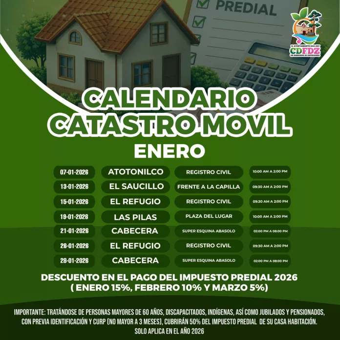 Aprovecha los descuentos vigentes en el pago del impuesto predial 2026, una oportunidad para ponerte al corriente, apoyar la economía familiar y contribuir al desarrollo de nuestro municipio ![]()