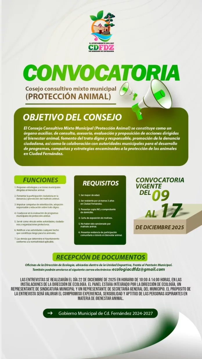 El Gobierno Municipal invita a la ciudadanía a participar en el Consejo Consultivo Mixto Municipal de Protección Animal, un espacio dedicado al bienestar animal, la promoción del trato digno y responsable, y el impulso de acciones que protejan a los animales de nuestra comunidad. ![]()