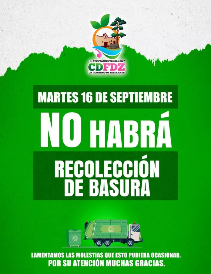 El Gobierno Municipal de Cd. Fernández informa que este martes 16 de septiembre no habrá recolección de basura debido a la conmemoración de las Fiestas Patrias.