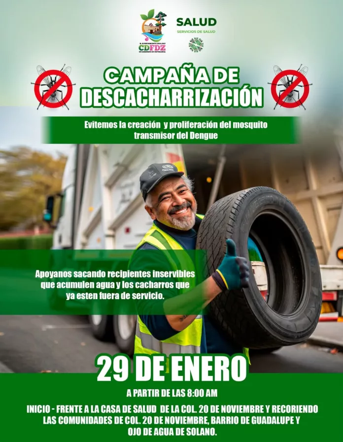 El Gobierno Municipal de Ciudad Fernández, a través de la Dirección de Salud y en coordinación con la Jurisdicción Sanitaria No. IV, llevará a cabo una intensa jornada de descacharrización este miércoles 29 de enero en las comunidades de Colonia 20 de noviembre, Ojo de Agua de Solano y Barrio de Guadalupe.