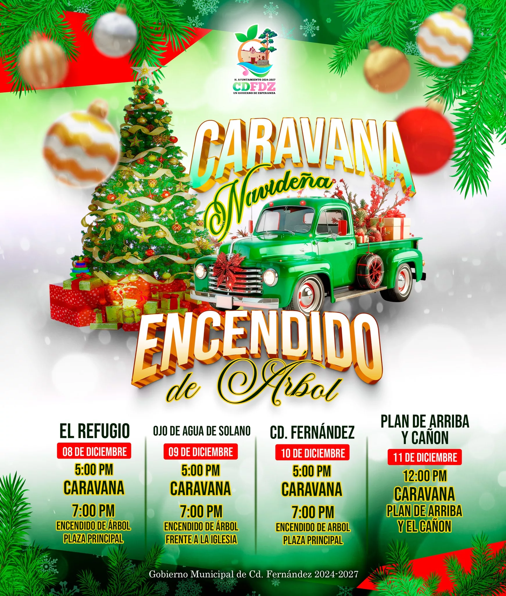 El Gobierno Municipal de Ciudad Fernández invita a todas las familias a disfrutar de las tradicionales Caravanas Navideñas y del encendido del Árbol, una celebración que une a nuestras comunidades con el espíritu de paz, esperanza y alegría que caracteriza estas fechas tan especiales. ![]()