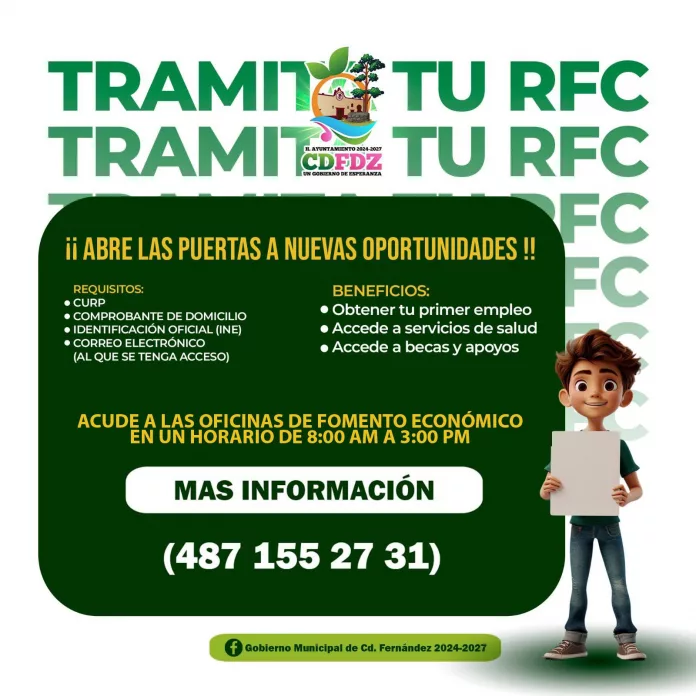 Desde el Gobierno Municipal de Ciudad Fernández 2024-2027, te invitamos a realizar tu trámite de Registro Federal de Contribuyentes (RFC) de forma fácil y accesible.