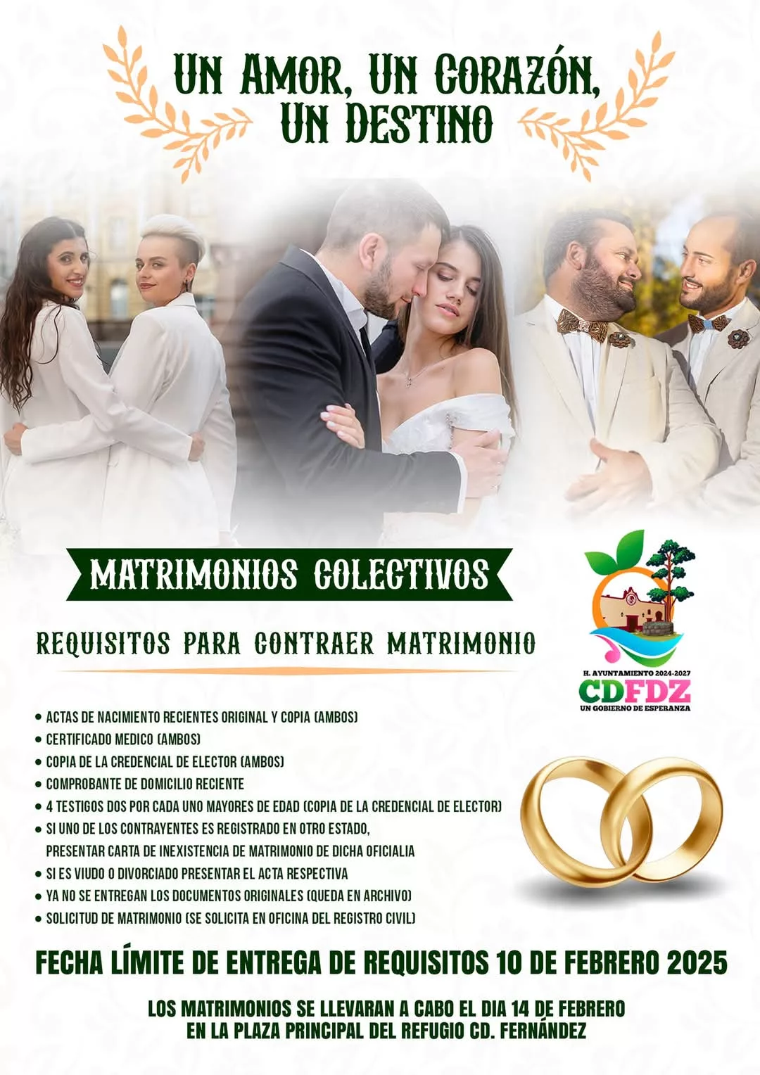 Este 13 de febrero es la última oportunidad para entregar tus documentos y ser parte de los Matrimonios Colectivos «Un Corazón, Un Amor, Un Destino», que se celebrarán el 14 de febrero a las 5:00 p.m. en la Plaza Principal de El Refugio.