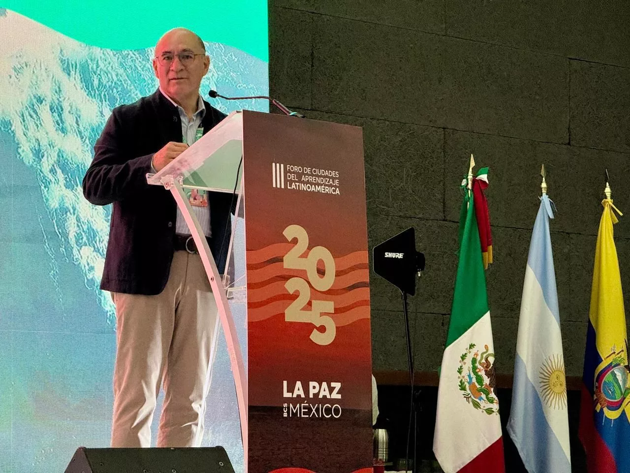 Ante autoridades como el Gobernador de Baja California Sur, Víctor Manuel Castro Cosío, la Presidenta Municipal de La Paz, Milena Paola Quiroga Romero, y representantes de la UNESCO, Galindo Ceballos destacó que el aprendizaje debe entenderse más allá de la educación formal. Señaló que también debe asumirse como una práctica cotidiana que regenere los lazos comunitarios, fomente la sostenibilidad ambiental y promueva la participación ciudadana en cada espacio urbano.