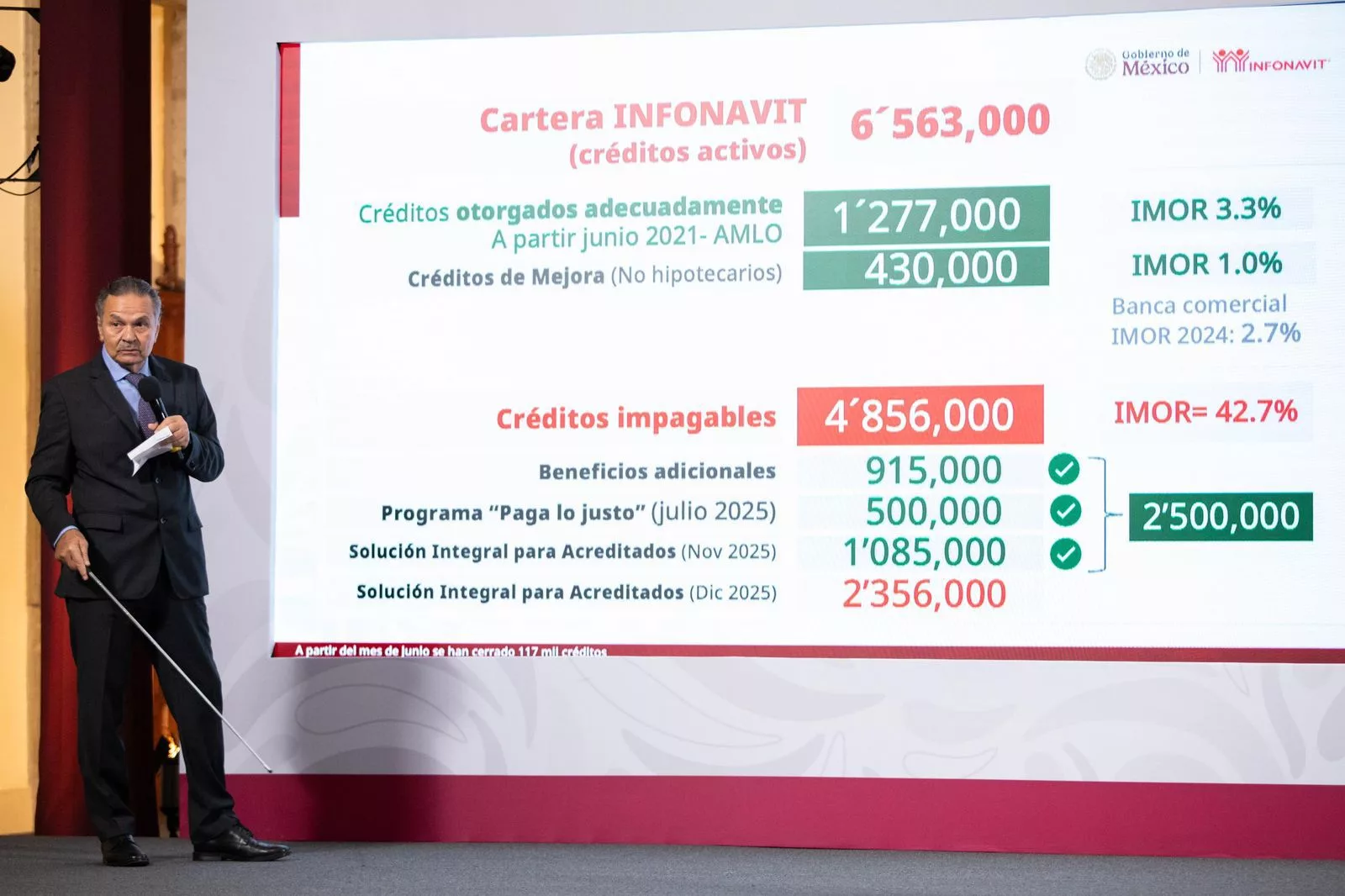 También informó que, de los 4 millones 856 mil créditos impagables, 915 mil ya recibieron beneficios adicionales como descuentos al saldo, baja de tasa de interés y de mensualidad; 500 mil fueron atendidos a través del programa Paga lo Justo y con Solución Integral 1 millón 85 mil, al cierre de noviembre. Para finalizar el año, se atenderán los 2 millones 356 mil créditos restantes, con lo que quedará resuelta toda la cartera impagable del Instituto.