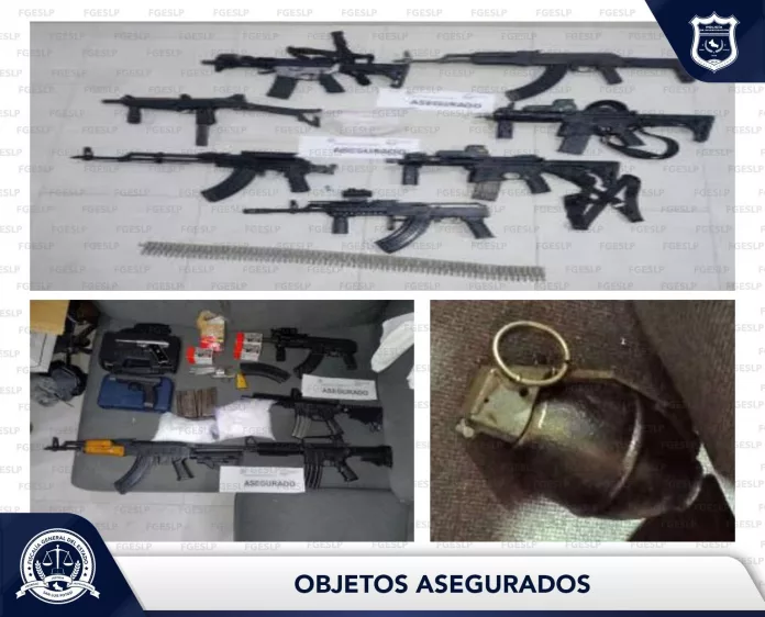 La Fiscalía General del Estado de San Luis Potosí (FGESLP), a través de la Policía de Investigación (PDI), cumplimentó una orden de cateo en la colonia 21 de Marzo, y aseguró posible droga, tres vehículos, 3 armas cortas, 11 armas largas y dos granadas.