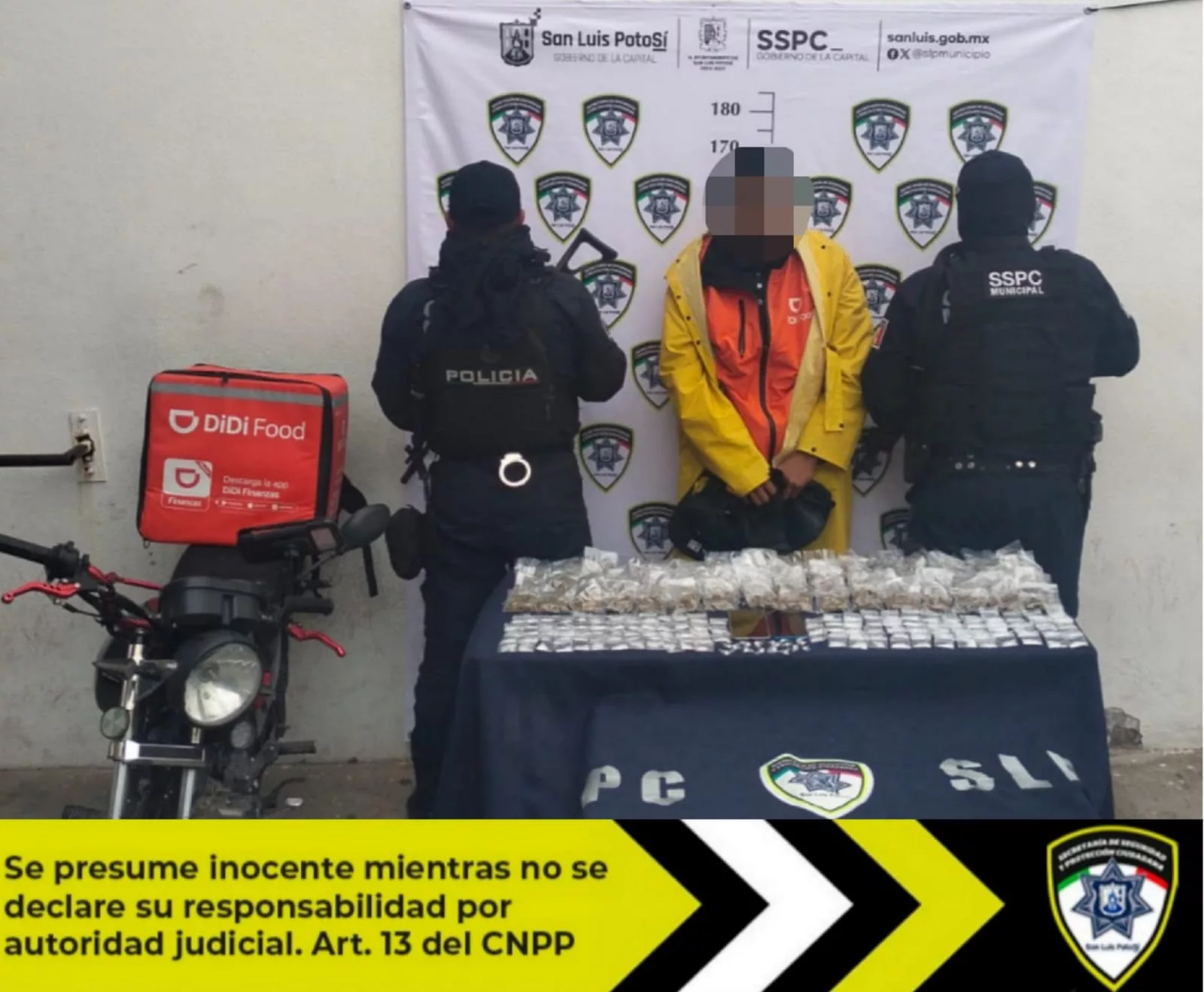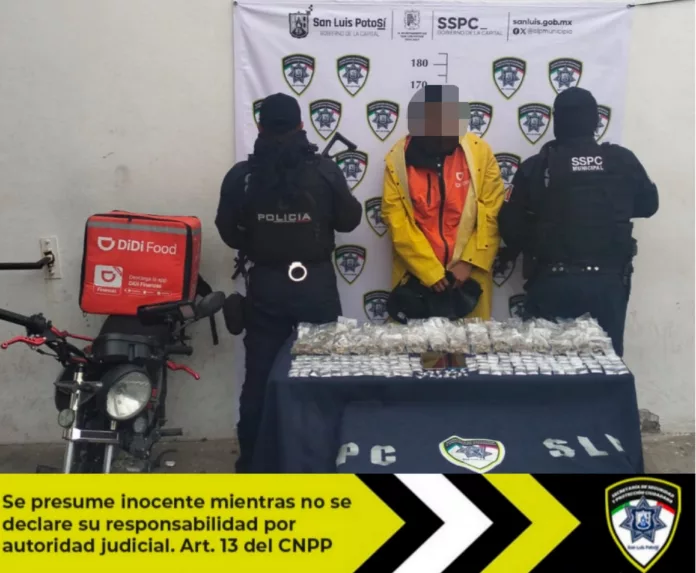 Al percatarse de la presencia policial, el detenido intentó deshacerse de una mochila color naranja con el logotipo de “Didi Food” arrojándola a la azotea de una vivienda, sin éxito. Al inspeccionar la mochila, los agentes municipales encontraron dos bolsas plásticas que contenían diversas dosis de droga. En total, se aseguraron 95 dosis de marihuana (807.5 gramos), 20 dosis de cristal en piedra (6.4 gramos) y 125 dosis de cristal en polvo (108.1 gramos).